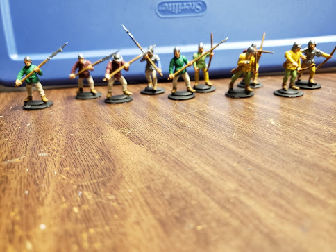 I got a box of 40 War of the Roses era English infantry back in April. I assembled them all this past week and on Saturday I painted the first 6 Billmen at the Adventurer's Academy, and then painted the first 6 archers this morning.